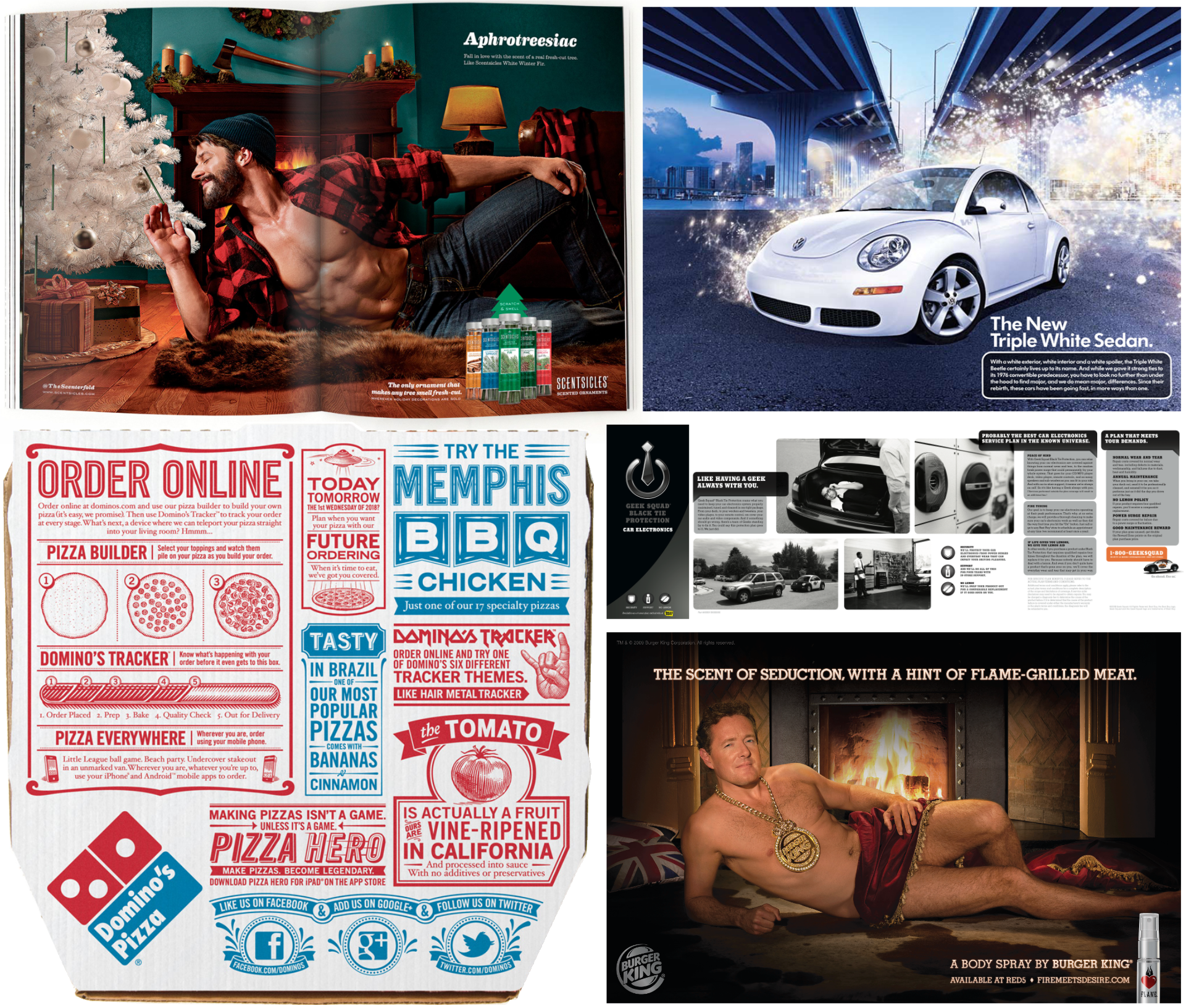 Clockwise: Agency: Made; CCO: Dave Schiff; CDO: John Kieselhorst; ACDs: Nate Bruning, Steve Dolan; CWs: Claire Wyckoff, David Satterfield; AD: Stephanie Sullivan; Studio Artist: German Murillo. Scentsicles are those piney aroma sticks to make artificial Christmas trees smell as authentic as the real thing. Agency: CP+B; CCO: Alex Bogusky; CDO: John Kieselhorst; Studio Artist: German Murillo. A multi-platform campaign for the VW New Beetle. Geek Squad, from its inception to the development of early brochures. Burger King magazine spreads at their finest, and most aromatic. A complete redesign of the traditional pizza box, unlike anything seen before.