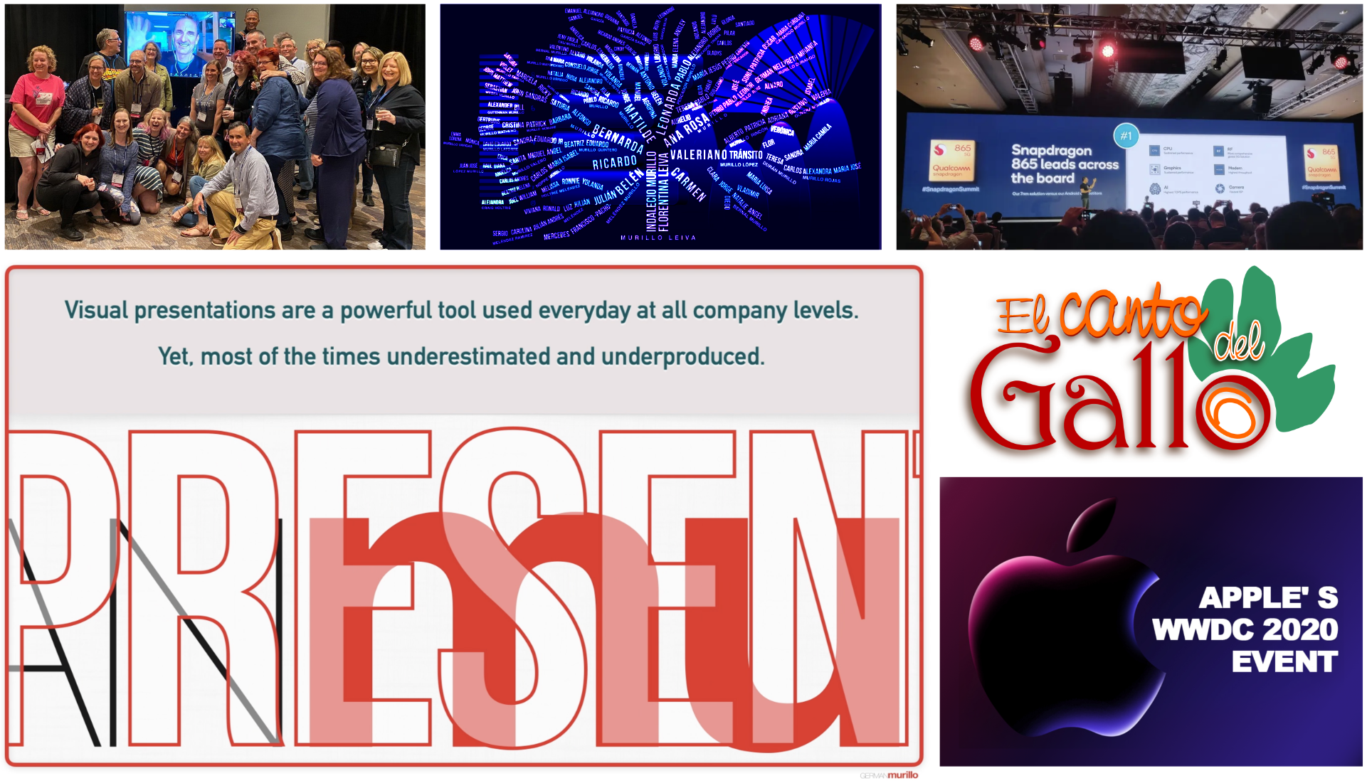 Narrative storytelling at its finest comes to life in high-end visual presentations. These multi-million dollar projects demand the best production designers to showcase their top-tier storytelling abilities. From top left: Presentation Summit in San Diego, learning from industry greats like Julie Terberg, Mike Parkinson, Echo Swinford, Nolan Haims, Ric Bretschneider, and Rich Altman. Each presentation is a world of its own, from a single keynote speaker to expansive multi-screen immersive experiences setups, such as Qualcomm's annual report or Apple's developer conference.